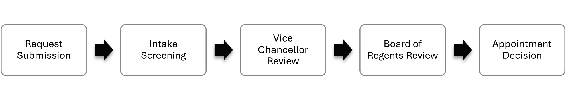 For positions requiring Board of Regents approval, the process follows a similar path but includes one fewer review stage. After Request Submission, Intake Screening, and Vice Chancellor Review, the request advances directly to the Board of Regents Review, where the final decision is made and recorded. Please note that the Board meets quarterly. Materials must meet published agenda submission deadlines for consideration at a specific meeting.