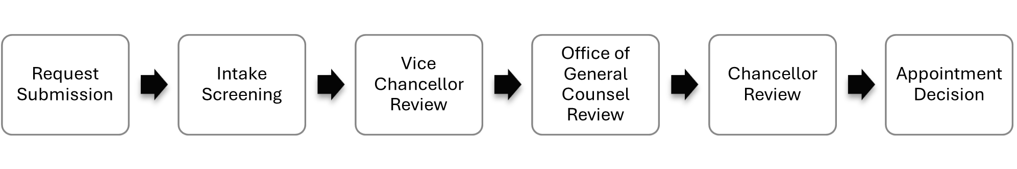 For positions requiring Chancellor approval, the request progresses through five key stages: Request Submission, Intake Screening, Vice Chancellor Review, Office of General Counsel Review, and Chancellor Review, followed by the Appointment Decision.